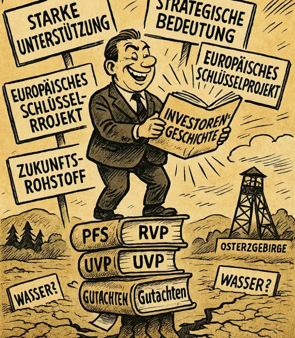 Die Realität im Osterzgebirge sieht anders aus. Die Machbarkeitsstudie läuft noch. Umwelt- und Sozialunterlagen mussten bereits korrigiert werden. Zentrale Fragen zu Wasserverfügbarkeit, Haldenflächen, Verkehr, Flächenverbrauch und Langzeitfolgen sind ungelöst. Der Widerstand vor Ort wächst.