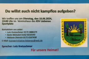 Im Moment gründet sich eine weitere Bürgerinitiative gegen den Standort Liebenau, die die Interessen der Bewohner von Liebenau, Waltersdorf, Walddörfchen, Breitenau und Börnersdorf vertritt. Das erste Treffen findet am Dienstag, den 18. Juni 2024, um 19:00 Uhr im Vereinshaus des KSV Liebenau am Sportplatz statt.